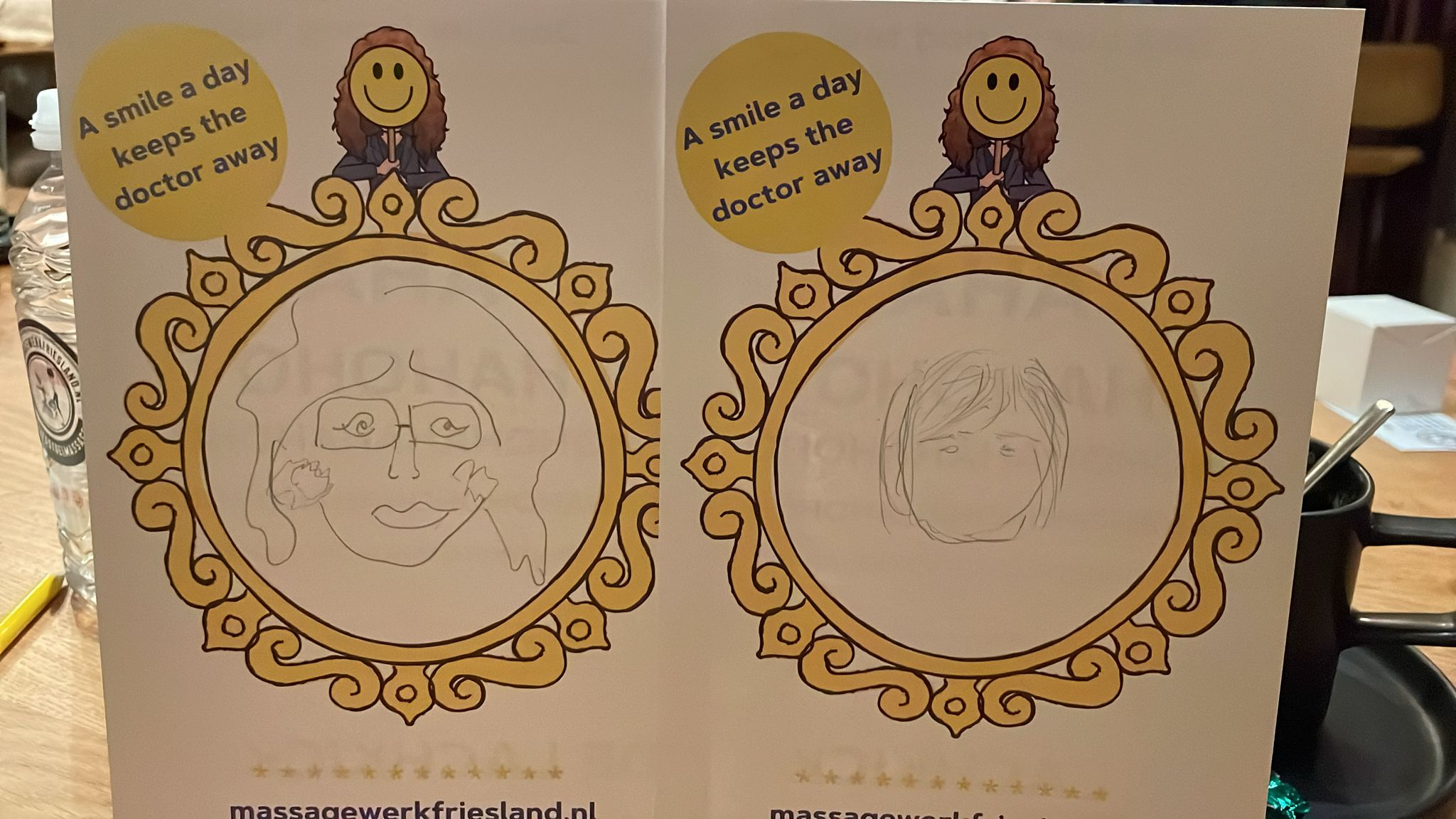 Na het diner verraste Alie ons met een energieke Lach Kick Workshop. Met veel humor en enthousiasme nam ze ons mee op een reis door de wereld van het lachen. We begonnen met een eenvoudige, maar verrassend leuke oefening: het maken van een tekening van onze tafelgenoot. Daarna doken we in de theorie achter het lachen en ontdekten we hoe gezond lachen eigenlijk is.
